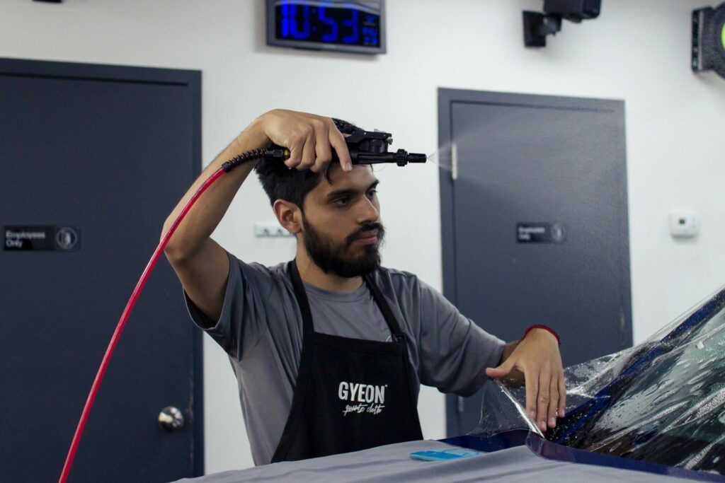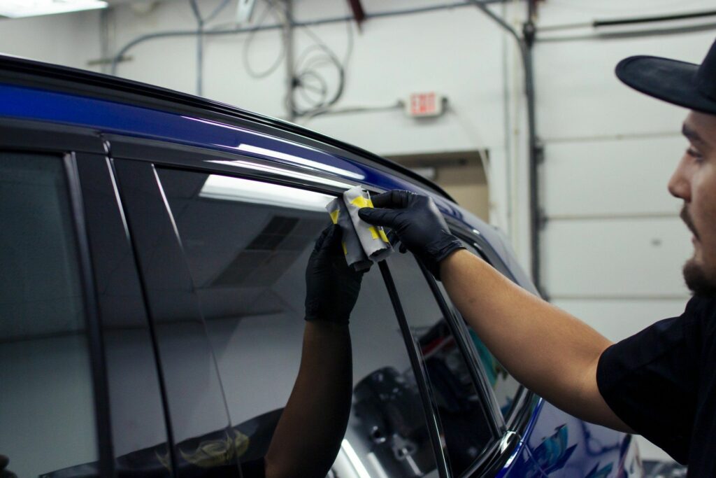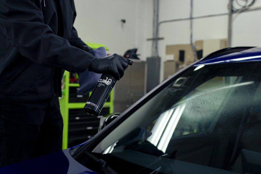 Before the DYNOflex can be installed, we used STEK Oil-X to prep the glass for the film installation. This STEK product is designed to strip the glass of any oils or sealants that may hinder the film application.