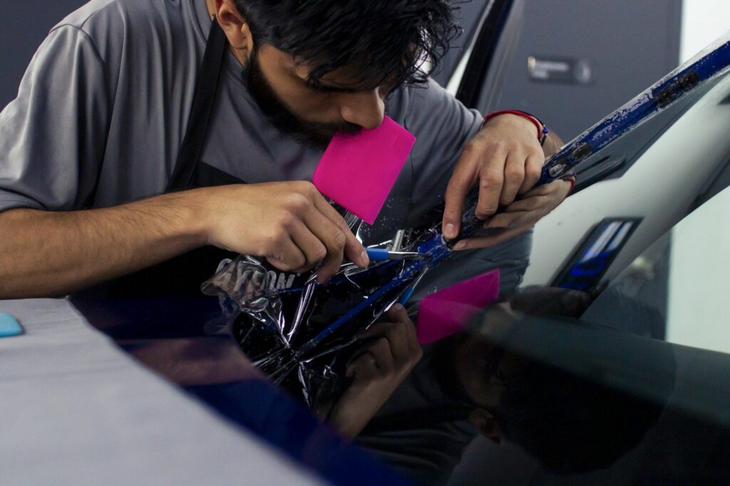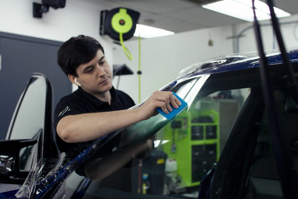 Now the STEK DYNOflex was laid out over the windshield. Our installers squeegeed the excess moisture from under the film, then trimmed, and wrapped all the edges around the glass to concluded the film coverage on this M series.
